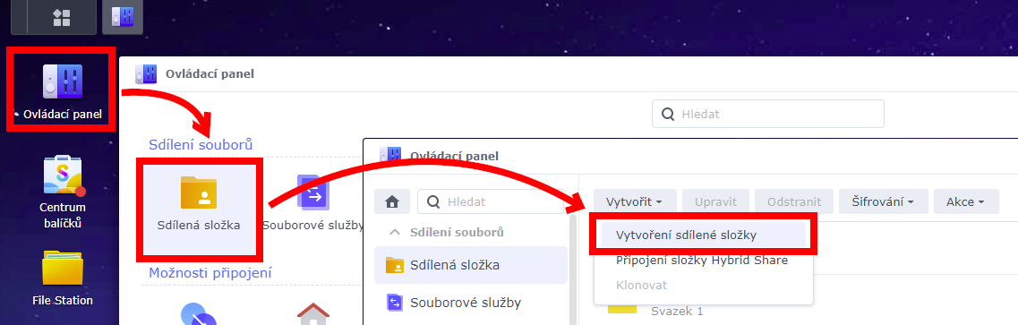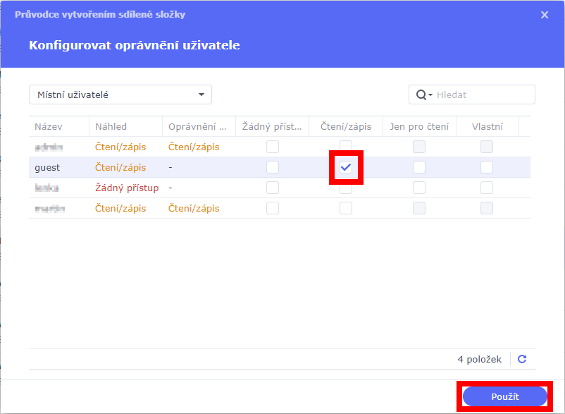 V ovládacom panely systému zvoľte možnosť „Zdieľaná zložka“ a následne „Vytvoriť / Vytvorenie zdieľanej zložky“. V okne sprievodcu vytvorením zdieľanej zložky je potrebné vyplniť jej názov, napríklad „Titan“. Postupne pomocou tlačidla „ďalší“ prejsť jednotlivými stránkami sprievodcu, kde je možné podľa potreby nakonfigurovať aj ďalšie nastavenia, ako sú povolená kvóta, kontrola integrity, šifrovanie a podobne. Na poslednej stránke sprievodcu je potrebné nastaviť oprávnenie pre používateľa, ktorý bude mať prístup k danému adresáru. V tomto príklade je pre jednoduchosť povolený prístup pre všetkých pomocou „guest. Pri vybranom používateľovi je potrebné nastaviť úroveň povolení na „čítanie/zápis“ a následne je potrebné kliknúť na „Použiť“.