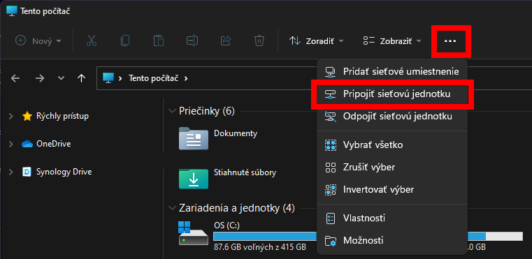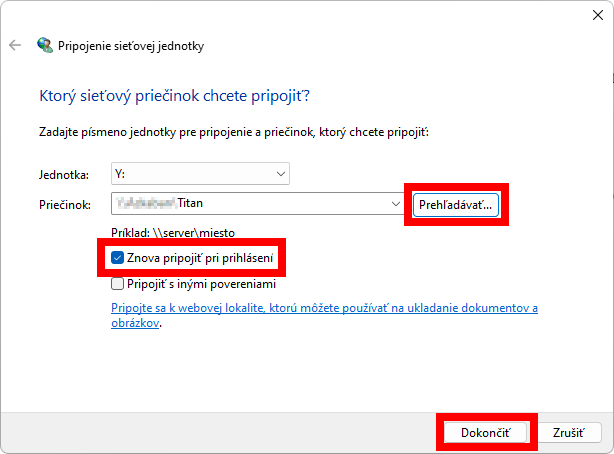 Na koncovom zariadení, kde je nainštalovaný zákazkový systém je potrebné pripojiť vytvorenú sieťovú jednotku. Otvorte „Tento počítač“ a v hornej lište zvoľte možnosť „Pripojiť sieťovú jednotku“. V sprievodcovi pripojenia sieťovej jednotky kliknite na tlačidlo „Prehľadávať“, v zozname označte vytvorený sieťový adresár a potvrďte kliknutím na tlačidlo „Ok“. Ďalej ponechajte možnosť „znova pripojiť pri prihlásení“ zaškrtnutú. V prípade, že je potrebná autorizácia používateľa (podľa nastavenia sieťového adresára) bude potrebné zadať prístupové údaje (meno, heslo).