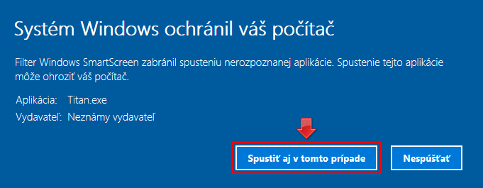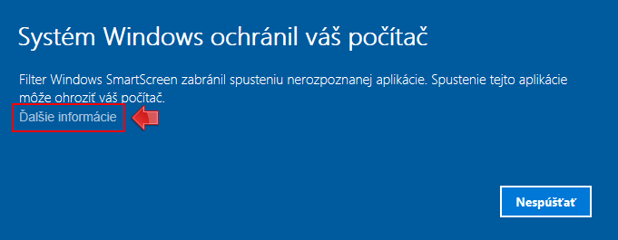 Ak je v systéme zapnutá funkcia Windows SmartScreen Filter, tak je nutné pri prvom spustení aplikácie povoliť jej spustenie. Povolenie spustenia je nutné potvrdiť aj po každej následnej aktualizácii aplikácie). V dialógovom okne zvoľte možnosť ďalšie informácie a pokračujte kliknutím na tlačidlo spustiť aj v tomto prípade.