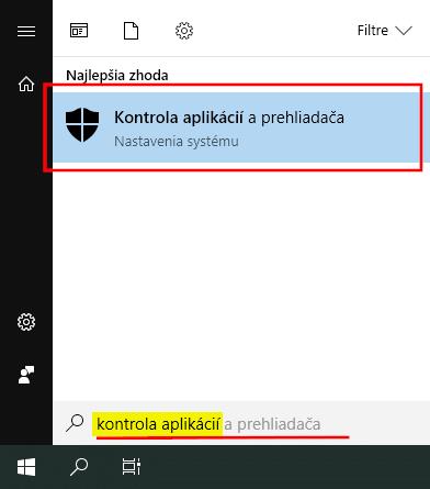 V systémovej ponuke štart nájdite možnosť: „Kontrola aplikácií a prehliadača“ (stačí, ak otvoríte ponuku štart a začnete písať text: „Kontrola aplikácií...“).