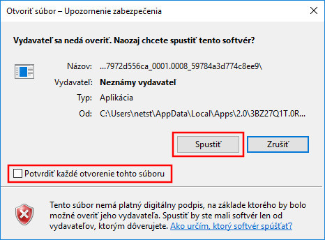 Teraz môžete spustiť program, pričom sa Vám zobrazí ešte jedno okno, ktoré je potrebné potvrdiť. Pre zjednodušenie môžete pred potvrdením odškrtnúť možnosť: „Potvrdiť každé otvorenie tohto súboru“.