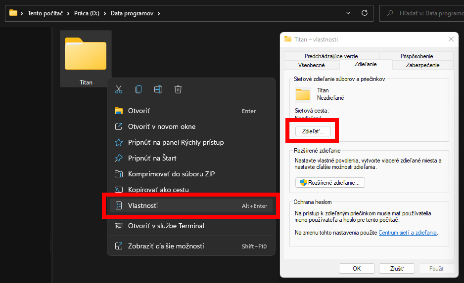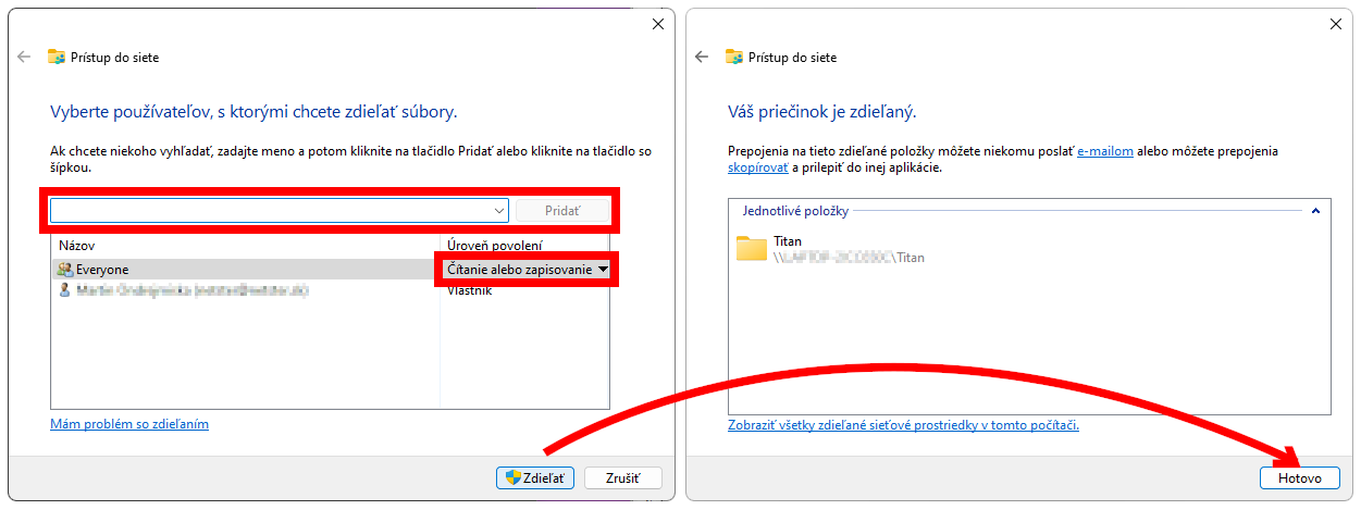 Na pevnom disku vytvorte nový adresár, napríklad s názvom „Titan“. Kliknite pravým tlačidlom na nový adresár a v kontextovom menu zvoľte možnosť „Vlastnosti“. Na záložke „Zdieľanie“ kliknite na tlačidlo „Zdieľať“. V okne nastavení podľa preferencií vyberte používateľa, ktorý bude mať oprávnenie pristupovať k danému adresáru. V tomto príklade je pre jednoduchosť povolený prístup pre všetkých „everyone“. Pri vybranom používateľovi je potrebné nastaviť úroveň povolení na „čítanie alebo zapisovanie“. Následne je potrebné kliknúť na „Zdieľať“ a „Hotovo“.