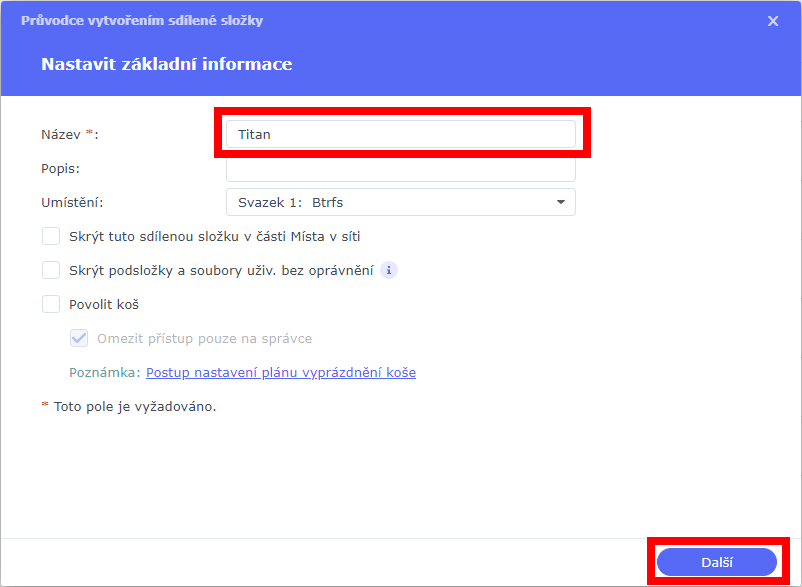 V ovládacom panely systému zvoľte možnosť „Zdieľaná zložka“ a následne „Vytvoriť / Vytvorenie zdieľanej zložky“. V okne sprievodcu vytvorením zdieľanej zložky je potrebné vyplniť jej názov, napríklad „Titan“. Postupne pomocou tlačidla „ďalší“ prejsť jednotlivými stránkami sprievodcu, kde je možné podľa potreby nakonfigurovať aj ďalšie nastavenia, ako sú povolená kvóta, kontrola integrity, šifrovanie a podobne. Na poslednej stránke sprievodcu je potrebné nastaviť oprávnenie pre používateľa, ktorý bude mať prístup k danému adresáru. V tomto príklade je pre jednoduchosť povolený prístup pre všetkých pomocou „guest. Pri vybranom používateľovi je potrebné nastaviť úroveň povolení na „čítanie/zápis“ a následne je potrebné kliknúť na „Použiť“.