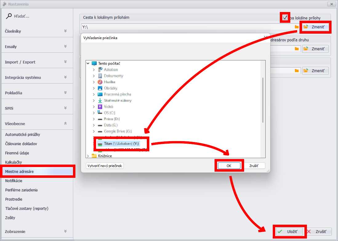 V nastaveniach zákazkového systému prejdite do časti „Všeobecne / Miestne adresáre“. V sekcii „Cesta k lokálnym prílohám“ zaškrtnite možnosť „Iba lokálne prílohy“, kliknite na tlačidlo „Zmeniť“ a v dialógom okne vyberte pripojenú sieťovú jednotku. Následne nastavenia potvrďte kliknutím na tlačidlo „Uložiť“ a program reštartujte.